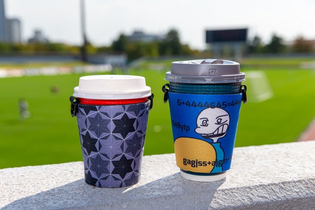 ストレッチカップスリーブは地球環境に配慮した伸縮性能の高いウェットスーツ生地を使用し、特許取得済のゴム仕様なのでコップを嵌め込むだけでジャストフィット。