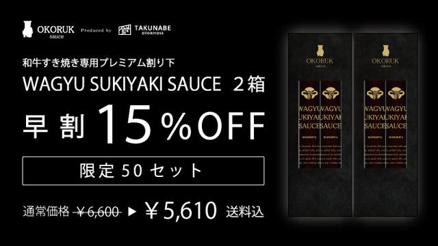 今回のプロジェクトでは、楽天市場の鍋ランキングNo.1に輝くなど、ご支持をいただき数々の賞やメディアにも取り上げられる、本格鍋料理のお取り寄せ専門店「TAKUNABE(タクナベ)」監修のもと誕生した、料理を引き立てる黒子的調味料ブランド「OKORUK(オコルク)」から、第一弾商品として「和牛すき焼きソース(割り下)」と、和牛オーダーカット専門店「club29」とのコラボによる「厳選黒毛和牛すき焼きセット」をMakuakeにて先行発売させていただきます。