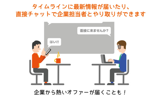 求職者となるユーザーはそんな企業の情報をもっと欲しい場合「フォロー」できます。そう、そこに応募ボタンはありません。「応募(エントリー)」ではなく「フォロー」です。「フォロー」することで、ユーザーは企業の情報をタイムラインで取得したり、チャットを活用して直接企業の担当者とやり取りができます。
