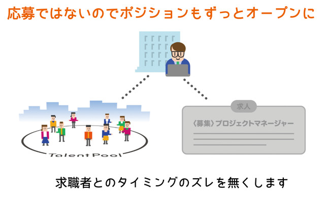 その理由は日本の採用サービスのほとんどは、企業が求人情報を公開して「待つ」、これを見た複数の求職者が「応募」するという形態が変わらないから。