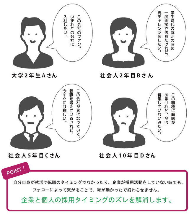 もしすぐに採用に至らなくてもフォロワーとなる人材とじっくり関係を構築し、タイミングの良い時に採用するという事が可能なので、不採用や辞退でさようならということはありません。