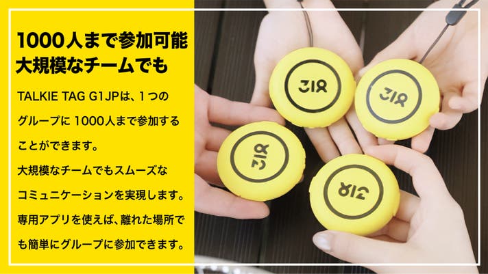 318 Talkie Tagは、スマホ連携不要で1000人のグループ通話を実現するグループトーク・ギアです。インターネット回線で、どこにいてもリアルタイムな通話体験を提供します。