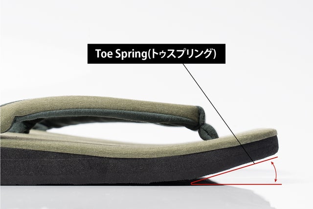 そこで、HANKAの雪駄はトゥスプリングと呼ばれる構造を採用することにより歩く際の爪先のつっかかりを軽減し、歩きやすさを追求した形状となっています。