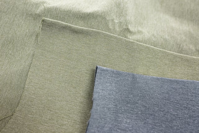 生地は杢調で、カーキは自然の中の木々、チャコールは少し青みがかかったグレー色で、山の河原にある石をイメージしています。自然に溶け込むカラーをイメージし生地を作っていただきました。