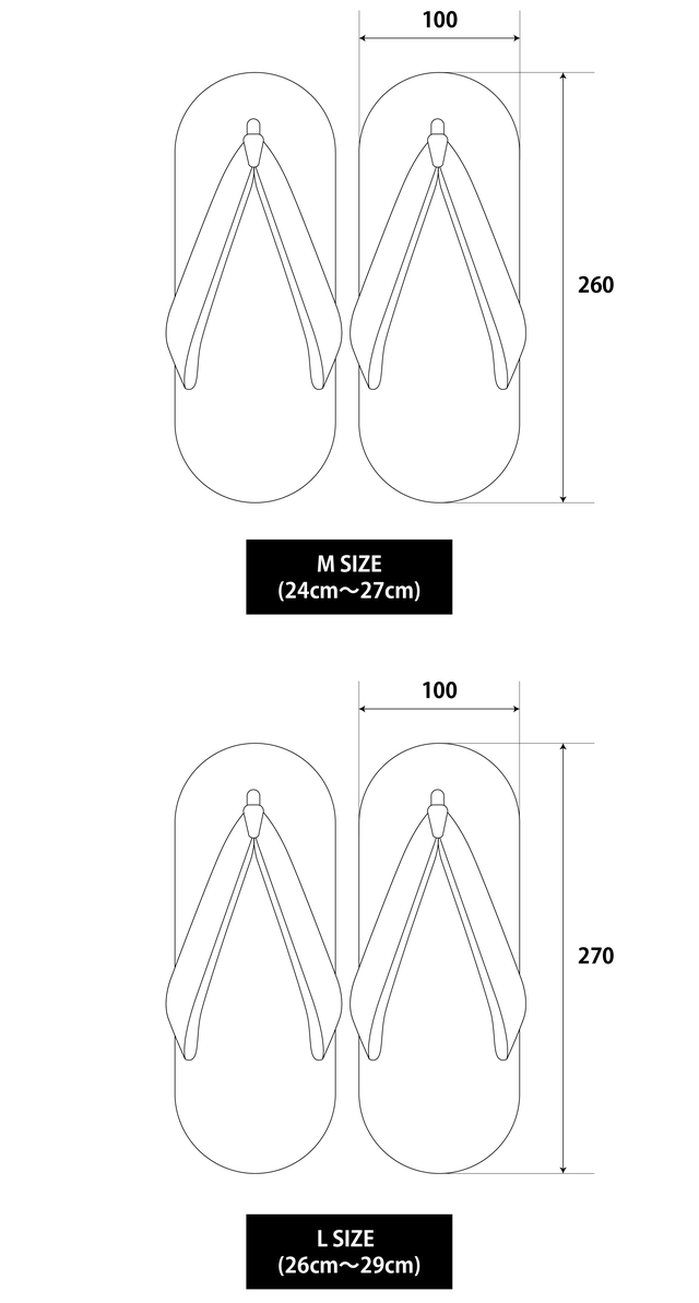 サイズはMサイズ(24cm〜27cm) とLサイズ(26cm〜29cm)の2サイズ展開となってます。Mサイズは女性でも無理なく着用していただけるサイズとなっています。