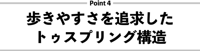 トゥスプリングとは、靴や雪駄を水平な床上に置いたとき、爪先部先端の地面からの立ち上がりの距離を示しています。このトゥスプリングが適当であれば、靴の先端部分が地面に当たらず躓きにくくなり、踵が軽く上がることで歩きやすくなります。