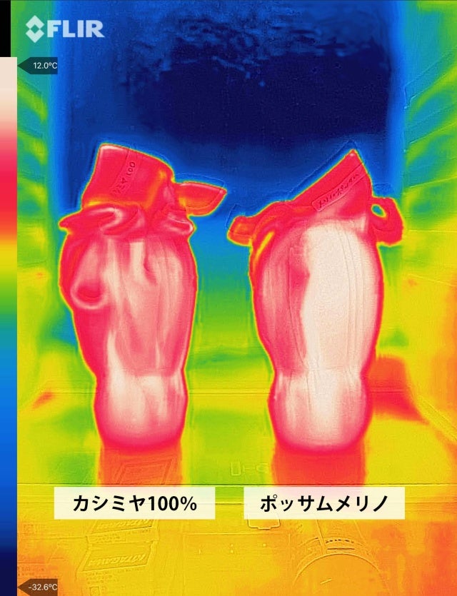 サーモグラフィーでは色が白い部分が一番温度が高く、ポッサムメリノの方がカシミヤ100%よりも暖かいということがお分かりいただけるかと思います。
