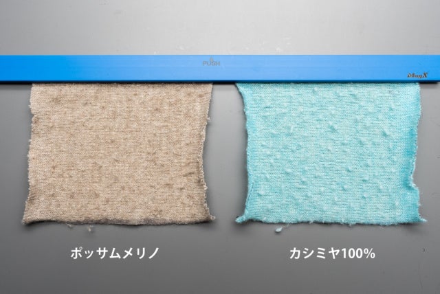 その点ポッサムメリノは摩耗に強く、そして毛玉が出来にくいという性質を持っています。今回は同じ編み方をしたカシミヤ100%の生地との比較でピリング(毛玉)の検査をしました。