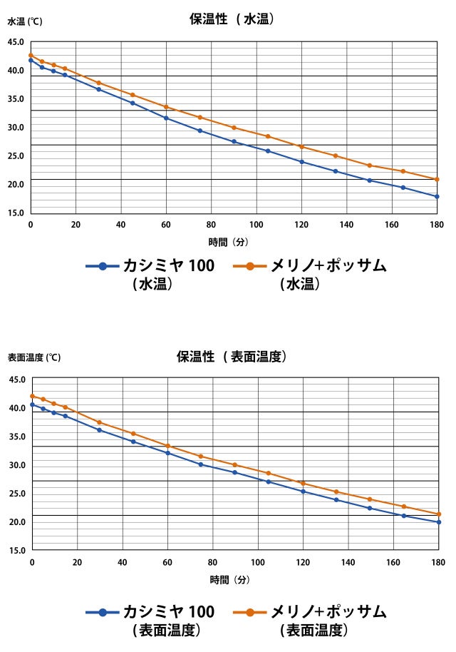 上記のグラフを見ていただけますと、カシミヤ100%(青グラフ)よりもポッサムメリノ(オレンジグラフ)の方が約2.5度ほど保温性に優れていることがわかります。