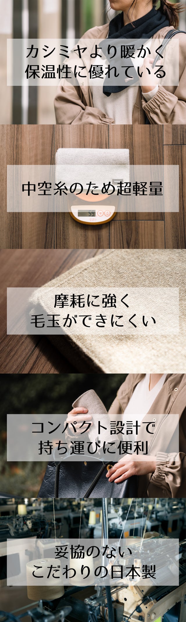 このポッサムを使用し作ったコンパクトマフラーには様々な機能や大きな特徴やこだわりがあります。