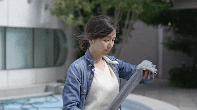 ポッサムコンパクトマフラーには通し穴があり、そこに通すことですぐ首に巻くことができます。今回は「手軽さ」を追求したプロダクトなので使用する際も楽に装着できるような工夫を施しました。