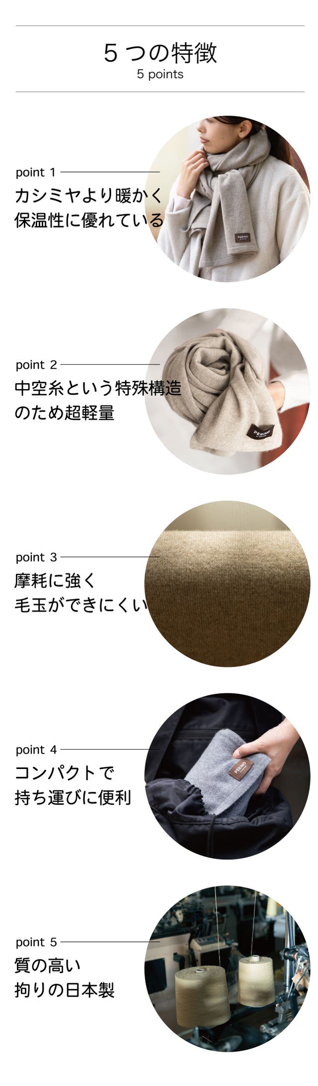 大判のストールブランケットは汎用性の高い使い方ができ、ミニマフラーはコンパクトで持ち運びに便利という個性のある商品展開でした。今回は、その2つのメリットをちょうど良い具合に取り入れ、サポーター様のご意見も取り入れ改善した「ベーシック」をとことん追求したマフラーとなっています。