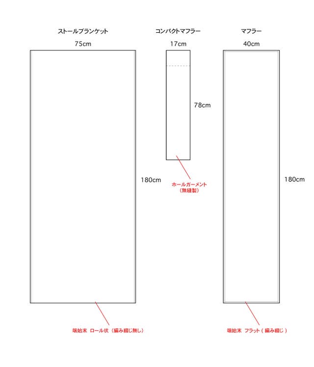 以前作らせていただいた「ストールブランケット」「ミニマフラー」との大きさの比較寸法はこのようになっています。