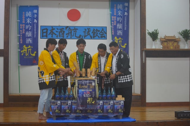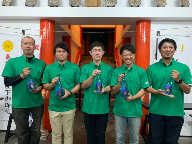 ⇧五人の種子島限定販売の日本酒をもって販売祈願祭をしました