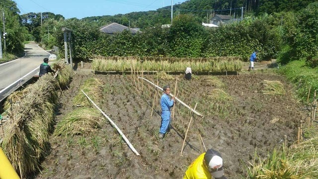 試験栽培でできた稲穂を天日でかわかしてる様子
