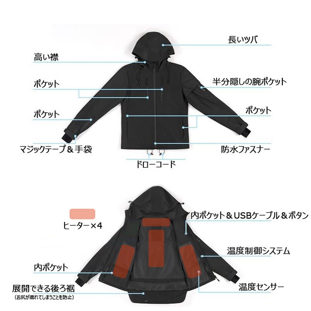- 防風デザイン、撥水生地を使用。ポケットが8個あり、利便性も高い。