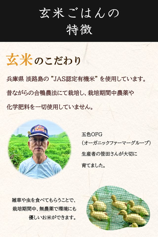 - 【こだわりの原材料】淡路島産合鴨農法の有機玄米を使用