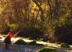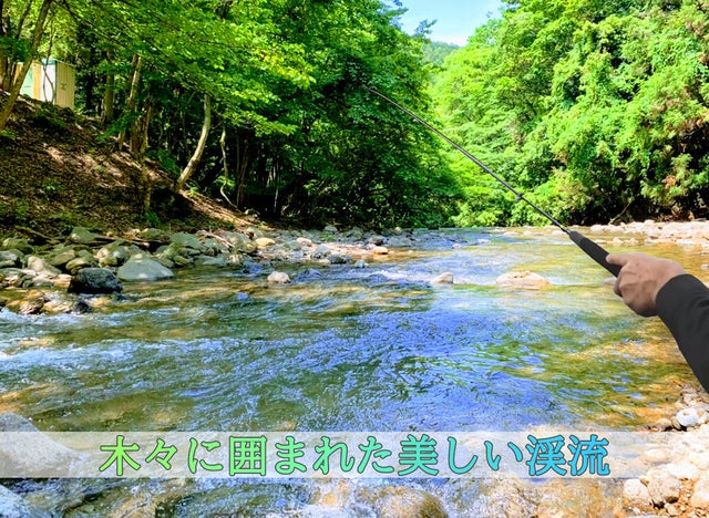 木漏れ日の中、美しい渓流で、イワナ、ヤマメ(アマゴ)、ニジマスなどを