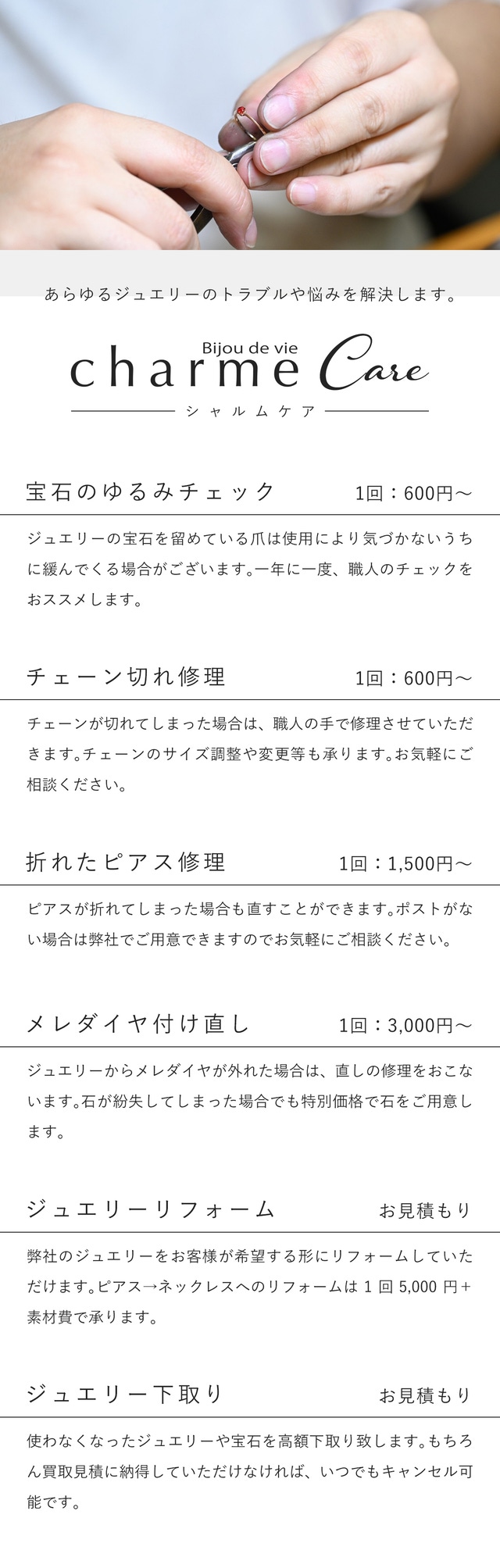 『charme』では、宝石の仕入れ方法やルートの開拓を徹底し、さらに通販限定にすることで中間マージンをカット。レアストーンや10金を使用したジュエリーにもこだわりつつも、お⼿にとっていただきやすい価格を実現できたと⾃負しております。