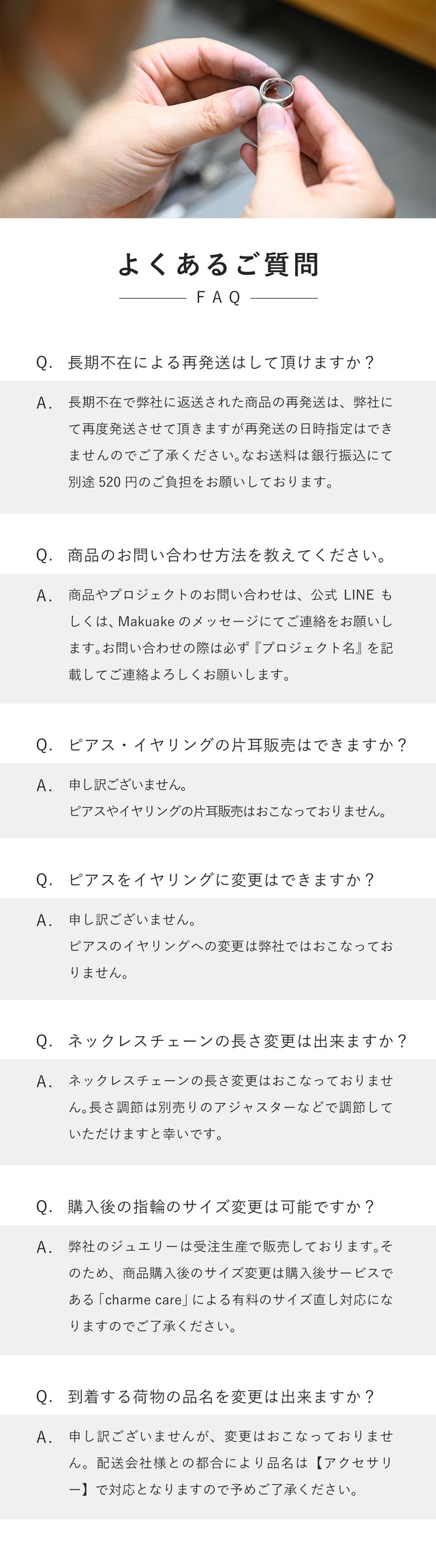 私たちは【シャルムジュエリー】を制作するために、工場とデザイン・仕様を実現できるよう、プロジェクトを誠心誠意進めています。 しかしながら開発中の工程において、デザイン・使用が一部変更になる可能性もございます。製造スケジュールについては、プロジェクト成功を想定した数で調整しておりますが、想定を上回る応援の申し込みがあった場合、製造や発送に伴うやむを得ない事情によりお届けが遅れる場合がございます。上記のようにプロジェクトページに記載している内容に変更がある場合は、活動レポートなどで共有を行っていく予定です。 本文中に記載させていただいたスケジュールは、あくまでプロジェクト公開時点の予定です。応援購入の性質上、配送遅延のおそれがございます。 原則として、配送遅延に伴う応援購入のキャンセルはできませんが、リターン配送予定月から3ヵ月を超えた場合には、希望者に限りキャンセルにて対応させていただきます。