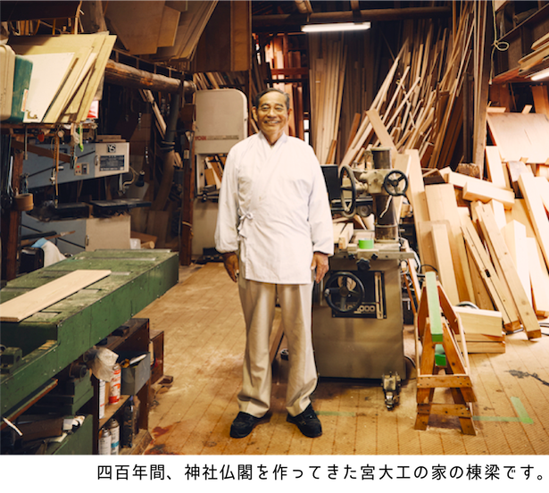その棟梁、山本吉治さんを訪ねました。桃山時代にこの奈良盆地に移り住み、神社仏閣の建築に携わってきた一族の九代目。「大工はどれだけいい木を持つかが勝負」と、倉庫にはうなるほどの材木が蓄えられています。もちろん、檜(ひのき)の板も。