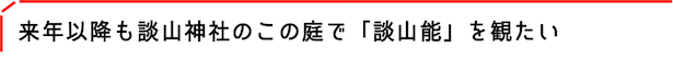 - この「談山能公演」を神社の庭で毎年開催し、日本の伝統を未来に繋げるために野外能舞台を贈りたい