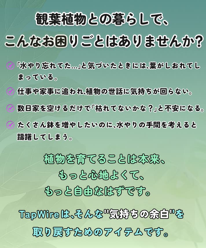 TapWire を使いはじめると「水やりしなきゃ」というプレッシャーが軽くなります。