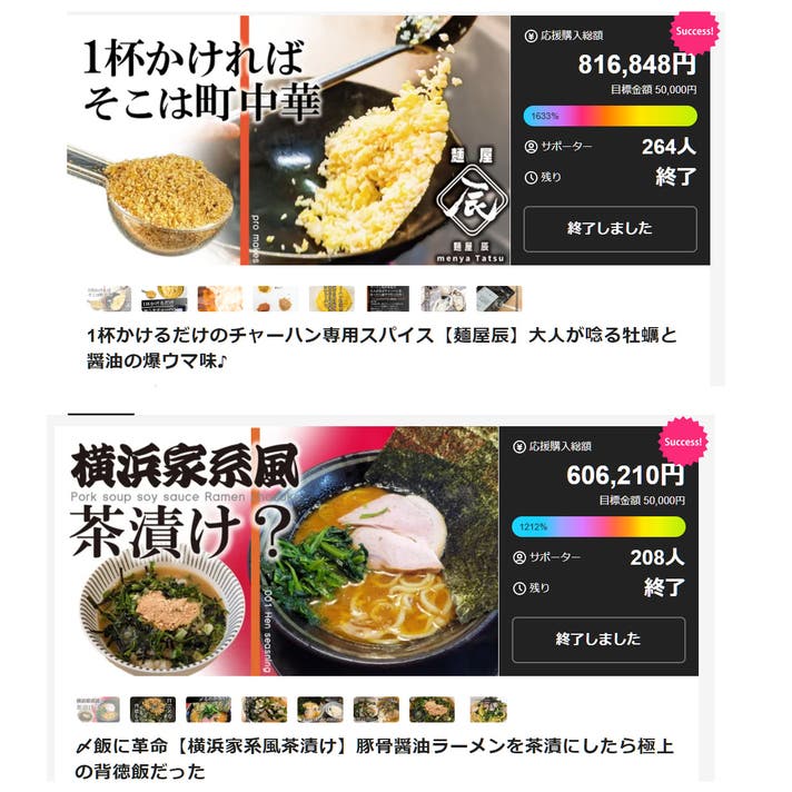 「名店のチャーハンスパイス」や「ラーメン茶漬け」などMakuake内でご好評頂いております。またプロジェクト終了後は公式サイトで一般販売させて頂いております。