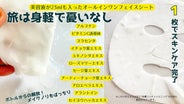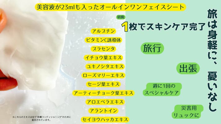 - かさばるボトルから解放!旅の荷物がぐっと軽く!スキンケアはこれ1枚で化粧ノリもばっちり