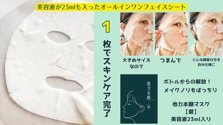 愛用者のいる碧シリーズの第2弾として開発する“他力本願マスク 碧”は、洗顔後に顔にのせるだけ。