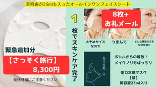 使い慣れないスキンケアで肌が乾燥して化粧がのらない、なんてことは恐ろしくてできませんでした。LCCで行く節約旅行。空港での待ち時間を少なくするため、機内持ち込みの荷物だけで準備したかった私は、旅支度にオールインワンのフェイスマスクをチョイス。その中でもシートの肌触り、厚み、ケア後の肌の調子の良さでお気に入りができました。でも、30枚入りの大容量。4泊5日の旅行に合わせて残りが12枚ぐらいまで使ってジップ付きの袋に入れて持って行きました。すると、ジップの中は、元々のフェイスマスクの袋についているジップが飛行機の気圧で開いたようで、美容液が漏れ出してベタベタに。移動の初日にげんなりしました。