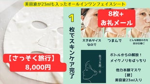 旅行に行く際はスキンケアの回数分だけポーチに入れて持って行ってください。化粧水、乳液の普段のベーシックなケアだけでなく、美容液成分がたっぷり入ったスペシャルケア並みのオールインワンフェイスシートマスクですので、身軽に旅行も出張も行っていただけます。