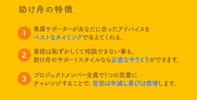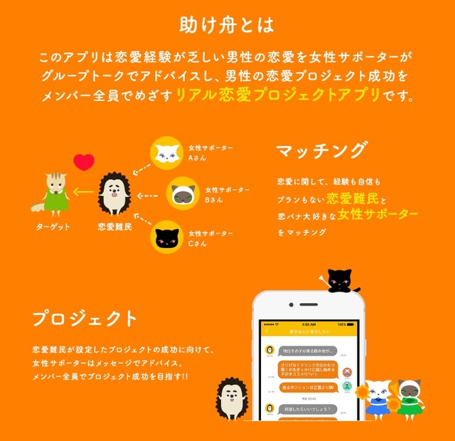 今まで交際経験がないあなたが初めての恋愛をするにあたって必要な役者は最低でも3人います。1人目はあなた自身、2人目はあなたのターゲット、3人目は相談相手です。恋愛には教科書がありません。ゆえに自分の考えだけでは行動に移すことは困難です。必ず相談相手が必要ですが、男性からのアドバイスより女性からのアドバイスのほうが明らかに有力です。しかし、今まで交際経験のないあなたは女性からアドバイスを得られる環境にないのがほとんどではないでしょうか?恋愛難民救助アプリ「助け舟」は恋愛経験の乏しい男性を恋バナ好きな女性がグループトークでサポートする構図を実現します。この構図はこれからの恋愛スタンダードになります。