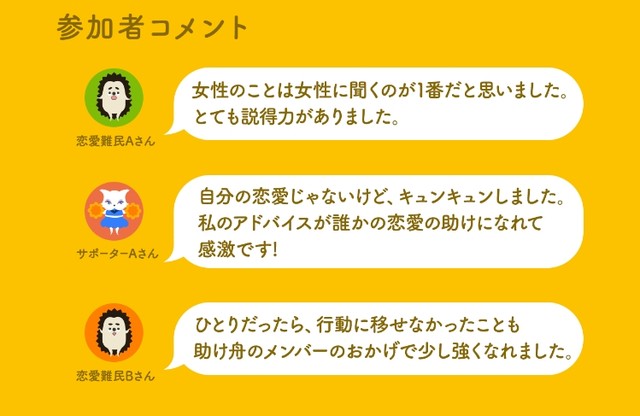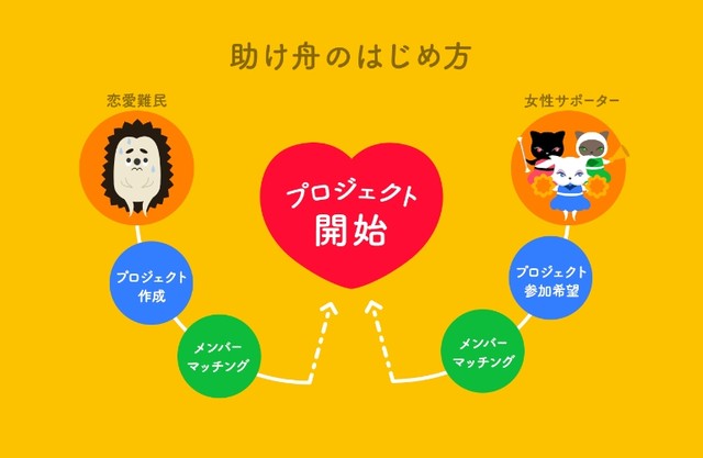 2016年4月、協力者を募り4人の恋愛難民と、11人の女性サポーターによる1ヶ月間のテスト助け舟を実施、期間中にカップル成立とまでは至らなかったものの、メンバーに後押しされて人生初の告白に挑戦した参加者もいました。