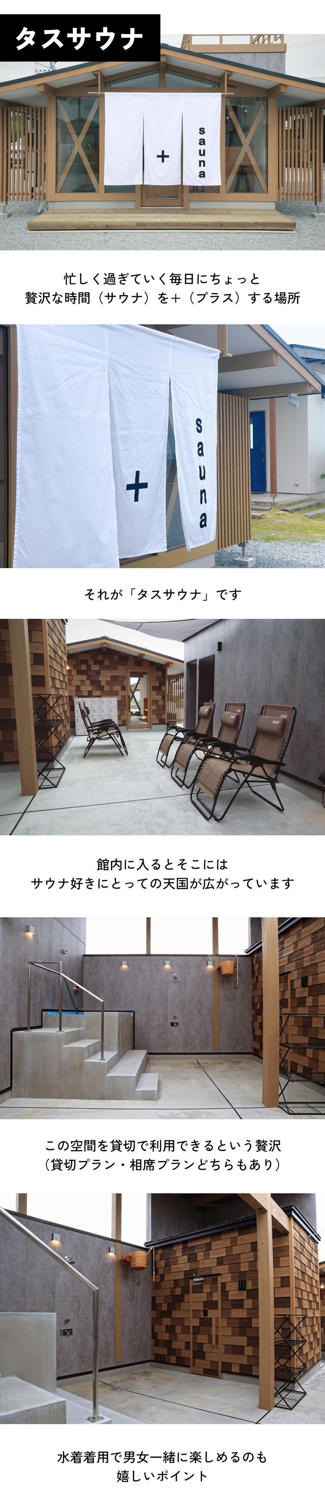1枚につき1名、「タスサウナ」を他の方と一緒のパブリックスタイルで100分利用することができます。