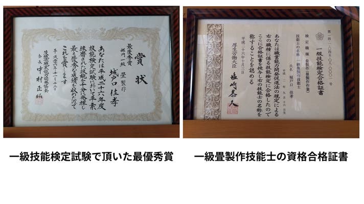 訓練校を卒業後、実務経験を経て一級畳製作技能検定では首席で合格し「最優秀賞賞」を受賞する。