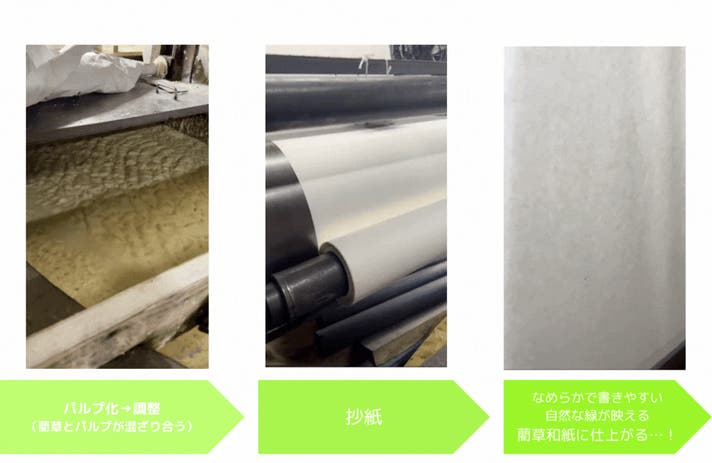 まるで、藺草の香りが漂ってくるような、優しい緑がほんのり映える自然な色合いの紙ができました。