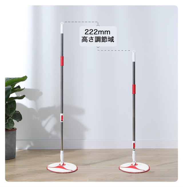 【簡単に使用】まずロックボタンを降ろして、手の圧力を使って、モップを上下移動する同時に回転して、遠心力で楽に洗浄と脱水を行います。モップを少し持ち上げると、上段脱水の位置になって、脱水することができます。モップを下ろすと、下段洗浄の位置を替えて、洗浄することができます。