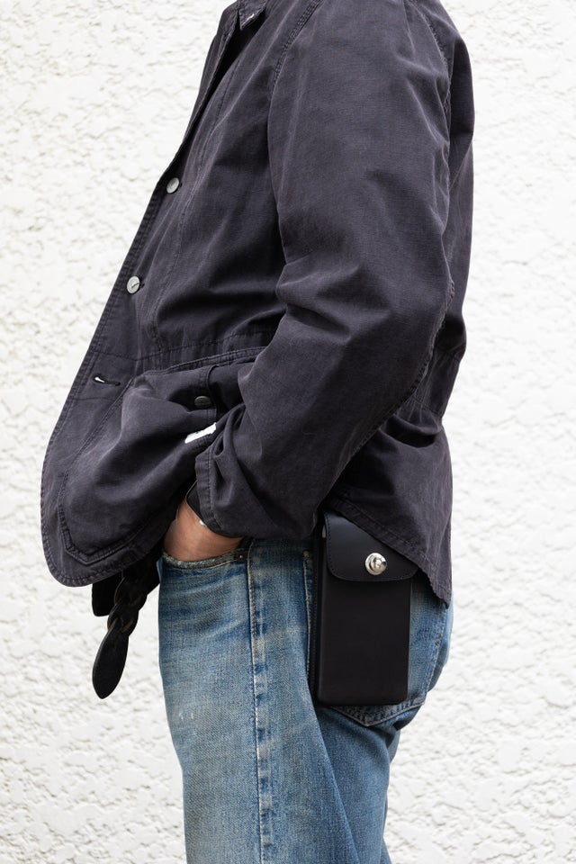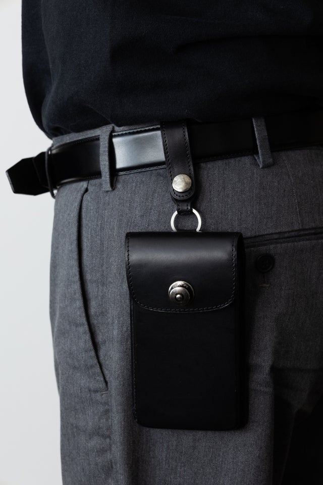 革のループでの吊り下げ式なので、ケースのポジションは腰より低い位置になります。これは上着を着ている時でも取り出しやすくするためです。アウターからチラッと見える様もイイ感じです。シンプルでベーシックなデザインなので、カジュアルからオフィシャルスタイルまで幅広く合わせられます。