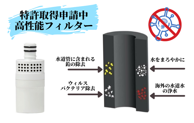 と三拍子揃った高級ステンレス素材を使用しています。フィルターはこれまでに水道水専用型と汚水にも対応する高性能型の開発に成功し、各国で認証を取得済みです。