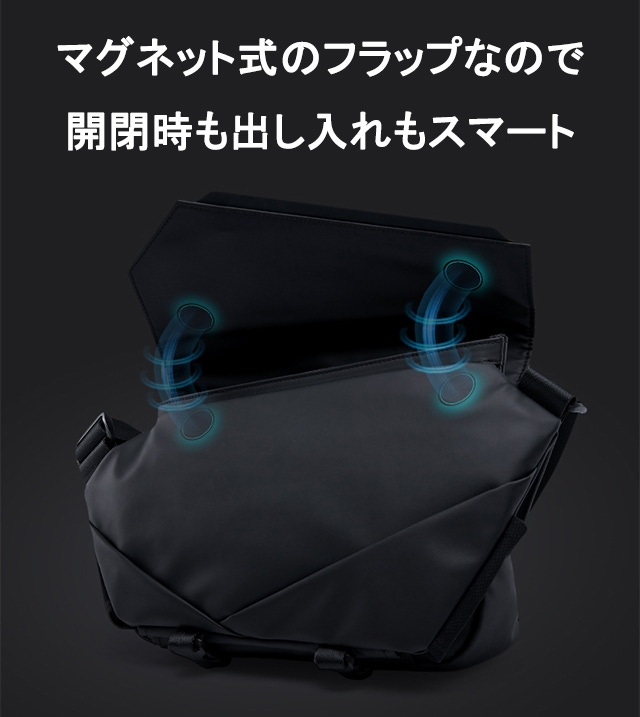 開閉部分のフラットマグネットで、歩きながらもしくは自転車に乗ったままでもすぐに荷物が取り出せます。
