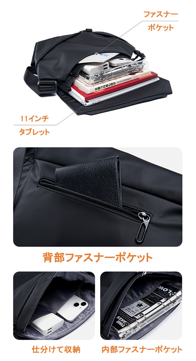 一見小型ではありますが、なんと11インチのタブレットまで収納できる、マチが広くて容量の多いスリングバッグです。