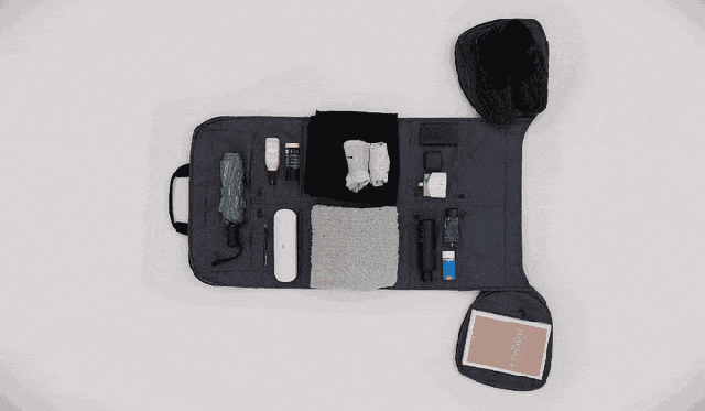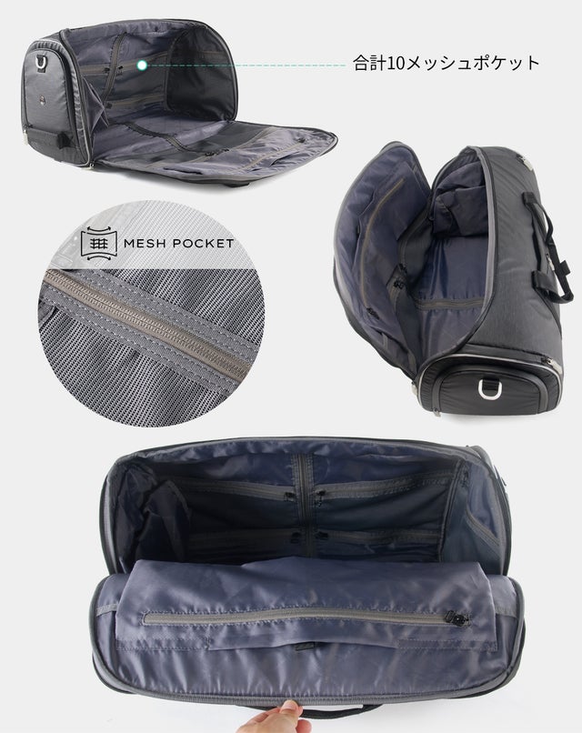 メッシュ素材を使った様々なサイズのスマートなポケットはタブレットや充電器、マウス、ベルト、ネクタイ、シューズ、貴重品など、様々な物を収納できるスペースを提供しています。