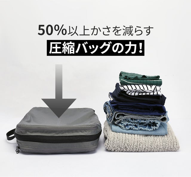TDN圧縮バッグを一緒に使うとより沢山の服を収納することができます。圧縮バッグは耐久性に優れたダイヤモンド形の生地で、伸びたり破れにくいです。