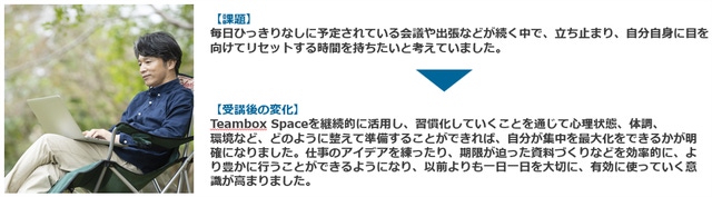 リーダーが「集中力」を鍛えることによりリーダー自身が自分を認識し、自分を管理する力を養うことができるようになります。そうすることにより、目の前の部下・クライアントとの関係や日々起こる事象などから学びを深め、一つ一つのことを最大限価値のあるものにしていきます。日々の自分のルーティンにTeambox Spaceを取り入れ、自分自身がいかにマインドフルな状態で生活を作っていくことができるかを探究することを通じて、やがてマインドフルの取り組みと日常の仕事(プレゼンテーション、契約交渉、車の運転、タクシー移動、ゴルフなど)との境界がなくなります。各仕事の質の向上だけでなく、今ここにある瞬間の価値や学びの最大化ができ、一人のリーダーとしても成長することができるのです。