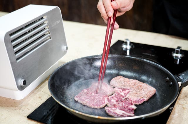 A:肉を焼いていると、最初に瞬間的に上に噴き出すのは煙ではなく、材料に含まれている水分が熱気によって蒸発することです。
