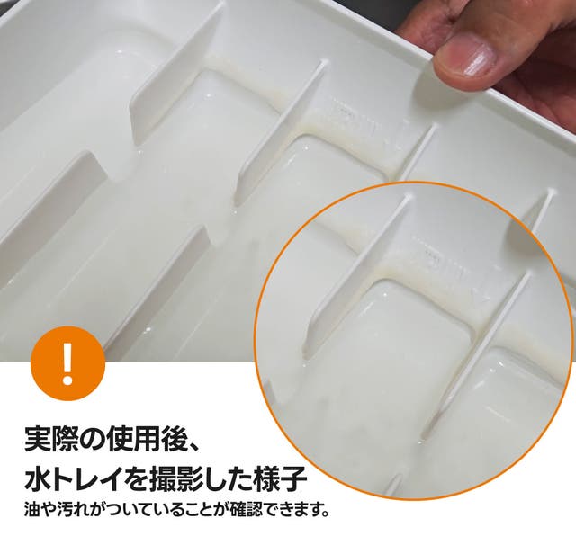 煙と油滴を水に接触させて溶解させる原理で作動するので、必ず水を先に満たしてから作動しなければなりません。製品裏面の水トレイを取り出し、水をMAXまで満たしてからご使用ください。