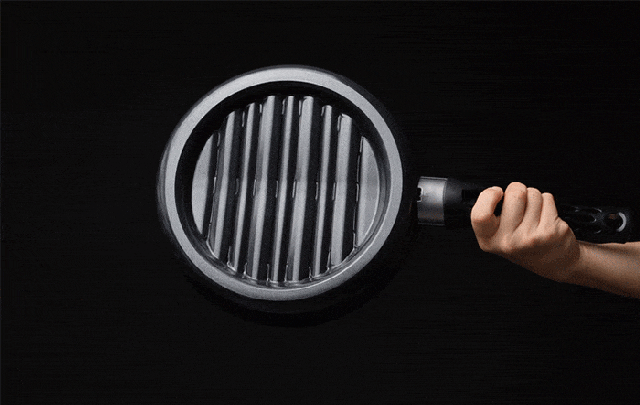 蓋の中に閉じ込められたスモークではなく、フライパンの中で火によって動くスモークが蓋をすることで、調理をする時に発生する熱を穴から下に噴出し、スモークを2回燃焼させて水分が外に出ないので、蒸したような肉汁を感じることができます。