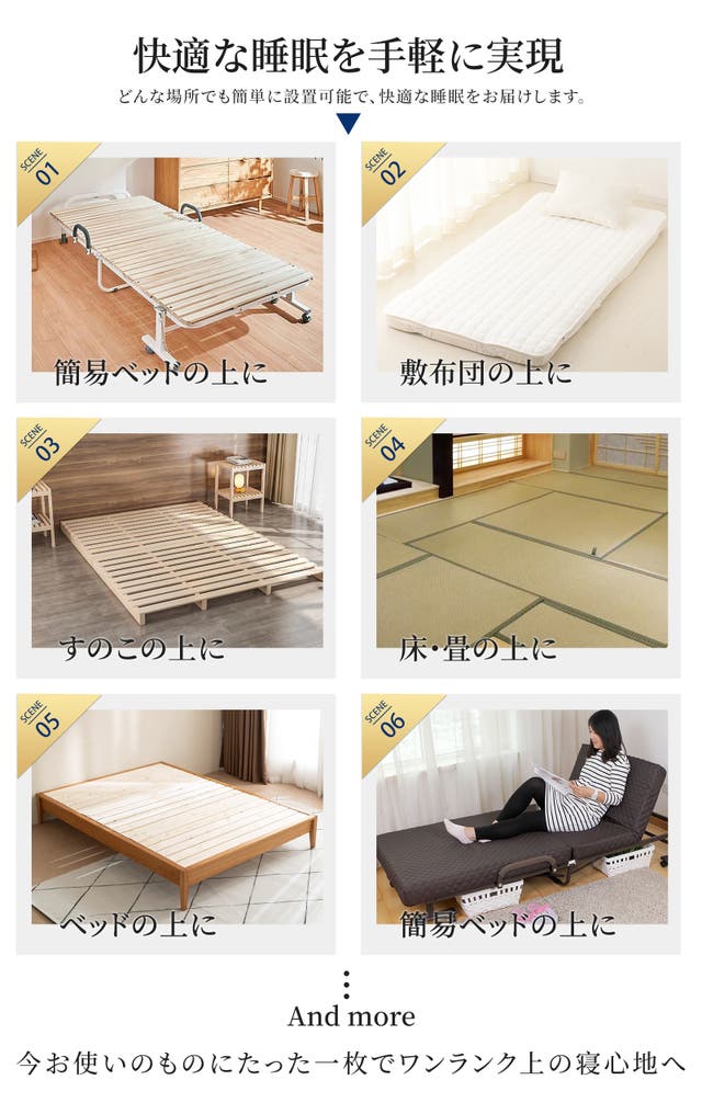A:はい、このマットレスはそのままご使用いただけます。また、現在お使いのマットレスや布団の上に重ねて使用することも可能ですので、既存の寝具を捨てる必要はありません。重ねるだけで、快適な睡眠をお楽しみいただけます。