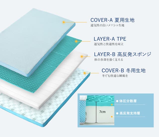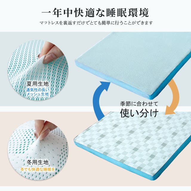A:はい、そうです。私たちのマットレスは特別に設計されており、高級TPEと高品質なスポンジを厳選して使用しています。これにより、夏季と冬季の両方で優れた睡眠体験を提供します。マットレスをひっくり返すことで、夏用と冬用モードを簡単に切り替えられ、1年を通じて理想的な睡眠環境をお楽しみいただけます。